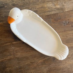 Plat canard vintage en céramique blanche – initiale “D” au dos