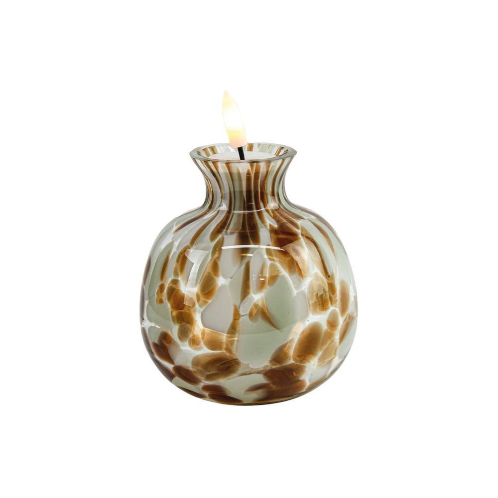 Boule LED décorative en verre tacheté kaki – style lampe à huile – Opjet – Ø 9,5 × H 13,5 cm