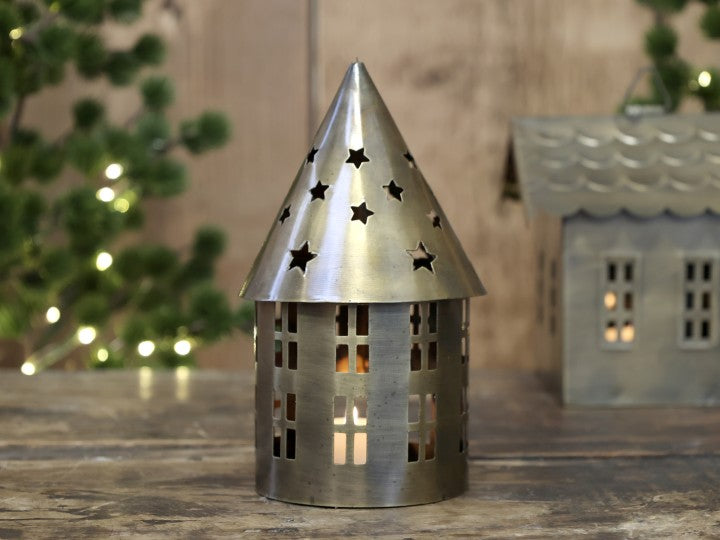 Photophore Maison en fer laiton antique – Grand modèle H22 × L23 × L14 cm