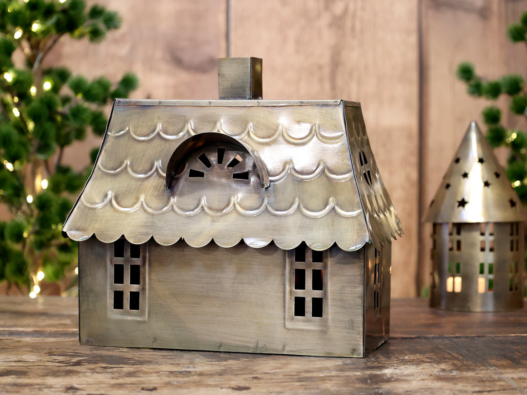 Maisons photophores chic antique en fer décor laiton – 2 dimensions – Déco chaleureuse automne & hiver