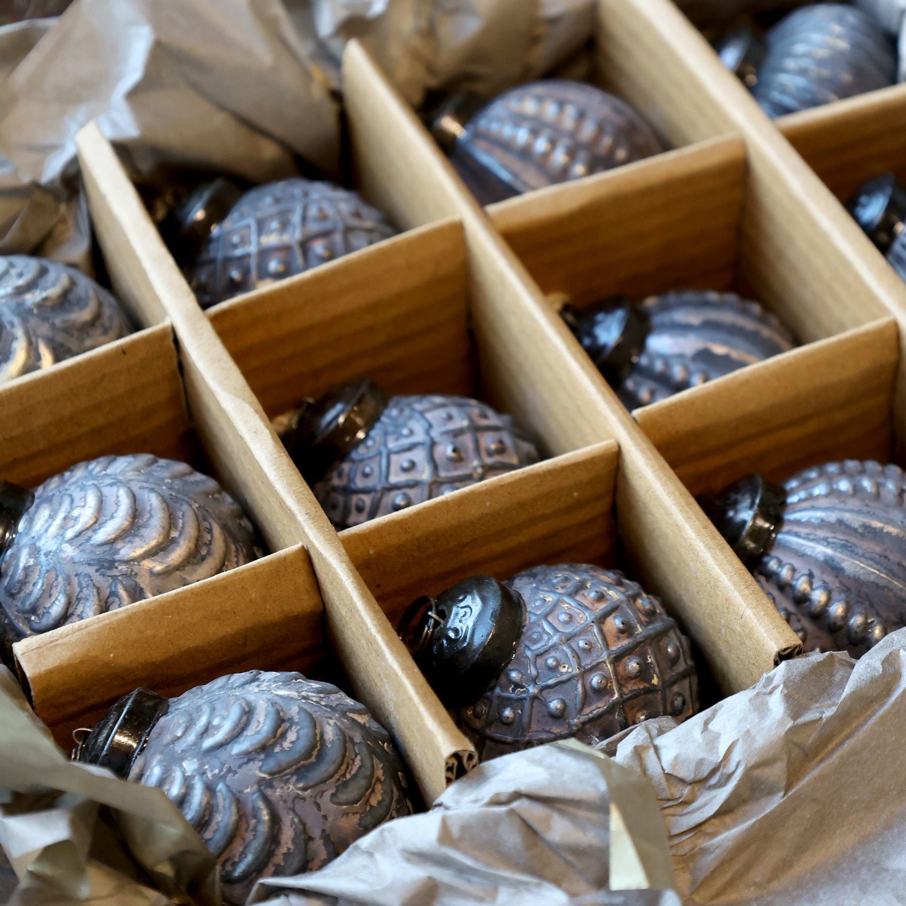 Superbe set de 12 boules de Noël Chic Antique en verre et laiton, teinte antique moka.